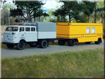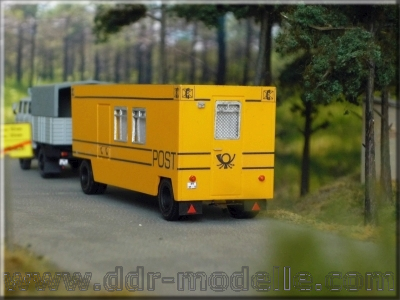 Das Postwesen in der DDR ist in drei verschiedene Bereiche aufzuteilen. Die "gelbe Post" war zuständig für Brief- und Paketsendungen, sowie dem Vertrieb von Zeitschriften. In den Bereich der "grauen Post" fiel das gesamte Telefon- und Fernmeldenetz. Zur "blauen Post" war Rundfunk und Fernsehen zusammen gefasst. Die Fahrzeuge waren in den entsprechenden Farben lackiert, was allerdings bis auf die Rundfunksparte in den späteren Jahren nicht mehr konsequent verfolgt wurde.
